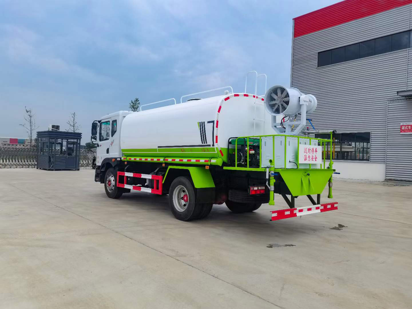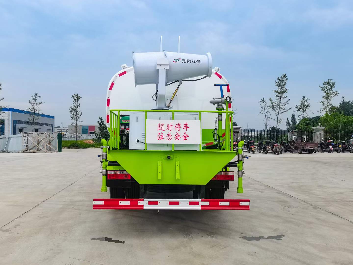 標(biāo)配:前沖、后灑、側(cè)噴、后平臺高炮、自流閥、消防接頭、濾網(wǎng)、噴頭、帶自吸自排。