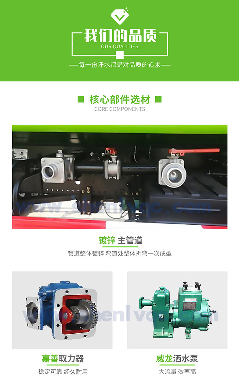 標配 前沖、后灑、側噴、后平臺高炮、自流閥、消防接頭、濾網、噴頭、帶自吸自排。