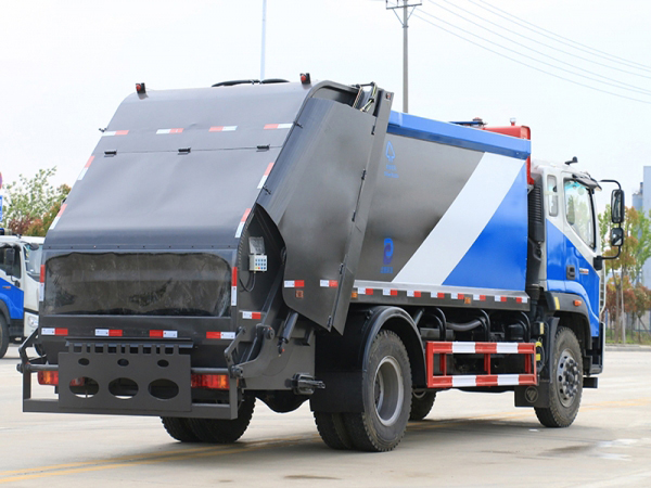 上裝配置:1,新款弧形箱體,增加箱體容積,整車更美觀,箱體為碳鋼制作,底箱及填充器采用加厚鋼板,耐腐蝕使用壽命長,一層油漆噴涂處理。2,裝載循環時間=25S;垃圾排出時間≤25S;填料提升角度≥95°,壓縮比例為1/3-1/2,一裝部分具備雙向壓縮和蠕動壓縮功能帶。3,新款結構加大填充器,手電一體操作模式,帶駕駛室操作,帶駕駛室一鍵卸料功能,3308軸距以上配遠距離遙控器,尾部裝置可以選裝垃圾翻轉斗,掛桶翻轉板或者大落地斗。4,CAN總線控制方式,光電開關加延時雙系統控制,降低故障率,方便維修。5,帶夜間照明裝置,6方)及以上車型帶雙污水箱,污水箱排水球閥和排水蓋,增加排水管,防止濺水,人性化設計。6,標配選用:威森搏樂油缸,威森搏樂多路閥,3308軸距以上配備壓實閥(背壓閥),所有車型標配單泵。5000軸距、后八輪車型標標配雙聯泵,大油量多路閥。