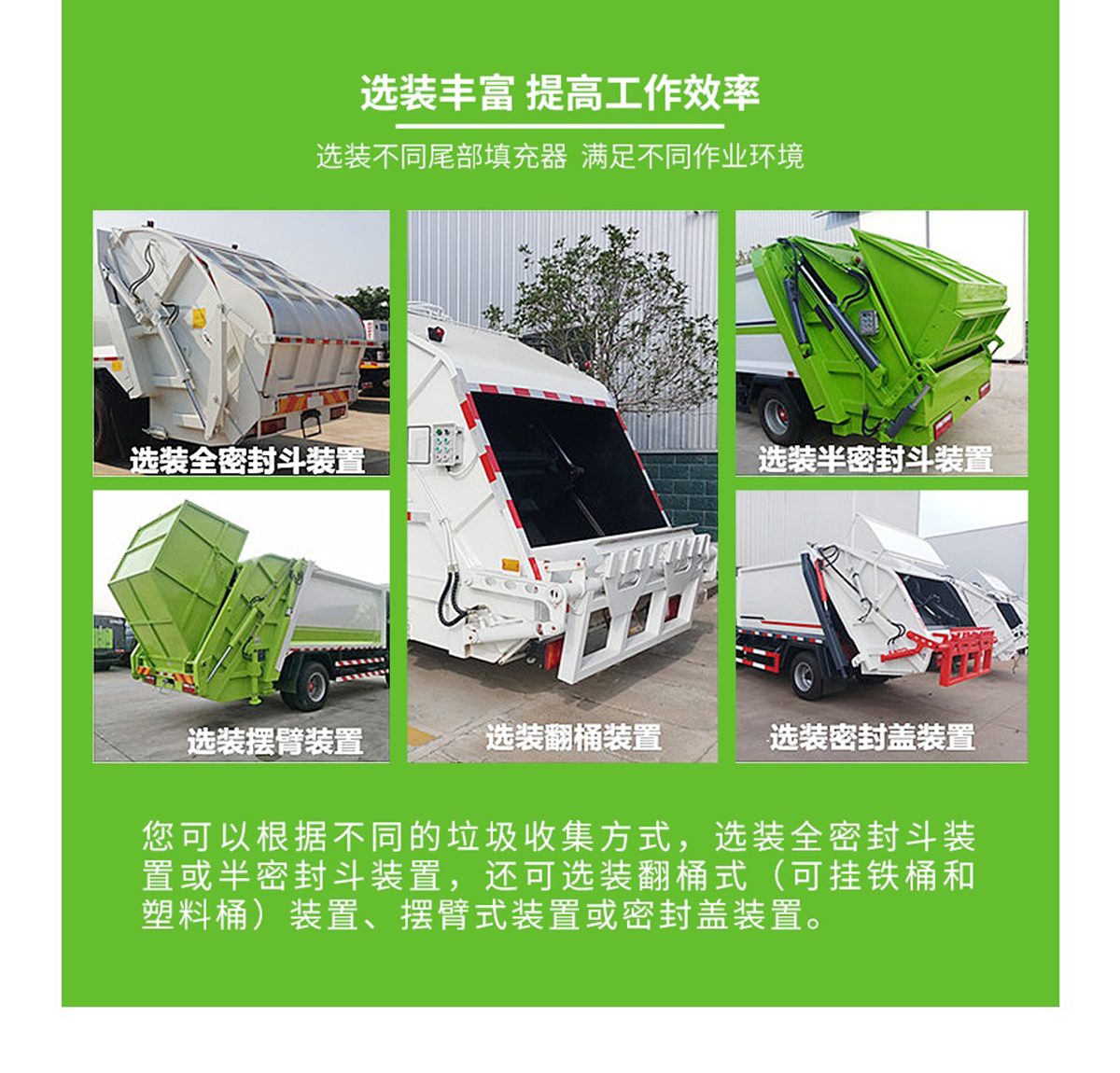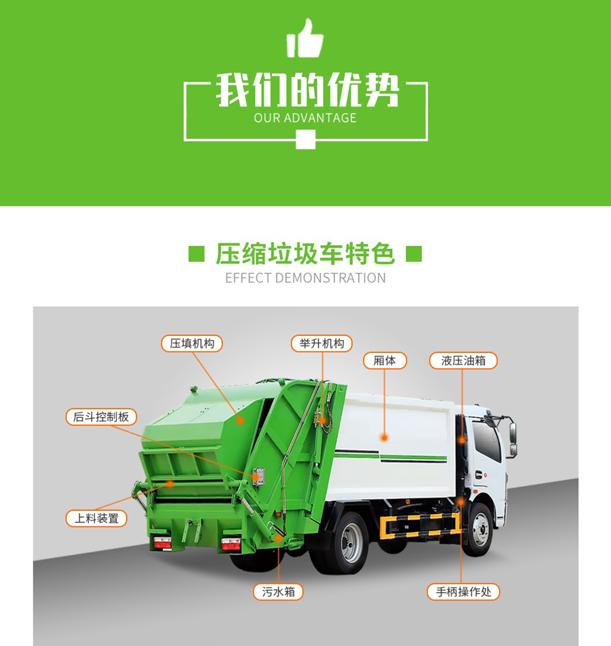 上裝配置:廂體有效容積約4立方米,側裝掛桶提升機構,可定制提升120L或240L垃圾桶,內帶全推板,尾部液壓開啟。